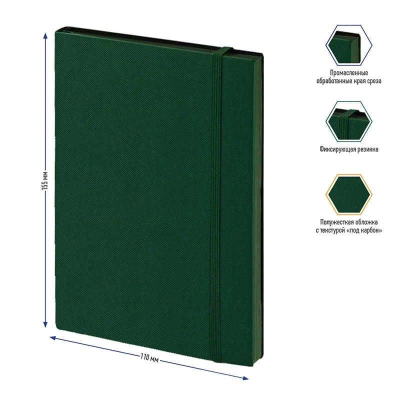 Записная книжка Berlingo Western формата А6 с полужесткой обложкой и стильным тиснением под карбон – идеальный подарок для деловых людей. Обложка и срез выполнены в зелёном цвете. Прошитый внутренний блок из 80 листов кремовой бумаги повышенной плотности 80 г/м? имеет перфорированные уголки и линовку в клетку. Вертикальная фиксирующая резинка. Записная книжка Berlingo Western подходит под персонализацию, внутри 2 удобные закладки-ляссе. В подарок – 3 комплекта стикеров с латинским, русским алфавитом и пиктограммами. Записная книжка представлена в размере 110*155 мм.