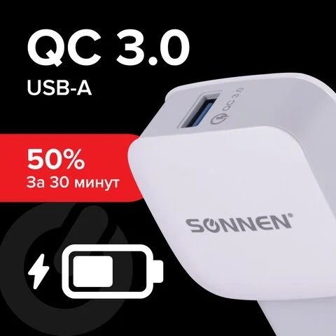 Зарядное устройство быстрое сетевое (220 В) SONNEN, порт USB, QC3.0, выходной ток 3 А, белое, 455506