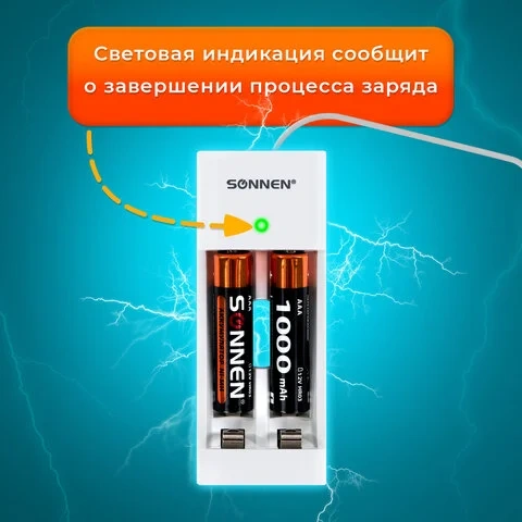 Универсальное зарядное устройство на два слота SONNEN BC2/1000 может заряжать одновременно два аккумулятора и способно работать как с 'пальчиковыми' (АА), так и с 'мизинчиковыми' (ААА) аккумуляторными батареями. Аккумуляторы AAA (в комплекте) предварительно заряжены.
