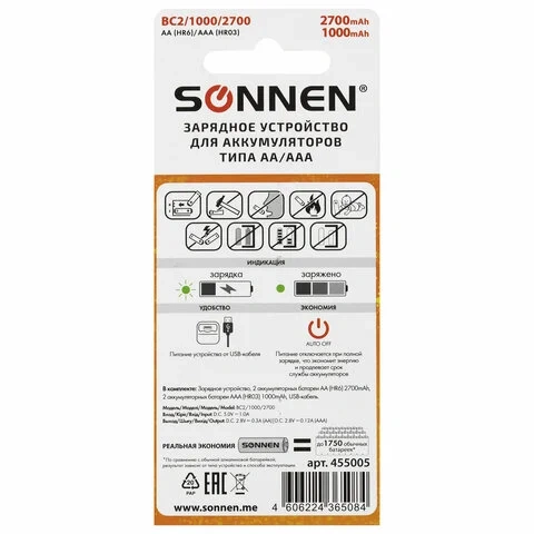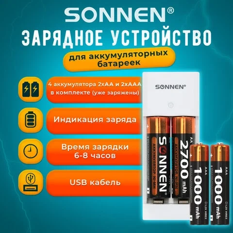 Универсальное зарядное устройство на два слота SONNEN BC2/1000/2700 может заряжать одновременно два аккумулятора и способно работать как с 'пальчиковыми' (АА), так и с 'мизинчиковыми' (ААА) аккумуляторными батареями. Аккумуляторы AA и AAA (в комплекте) предварительно заряжены.
