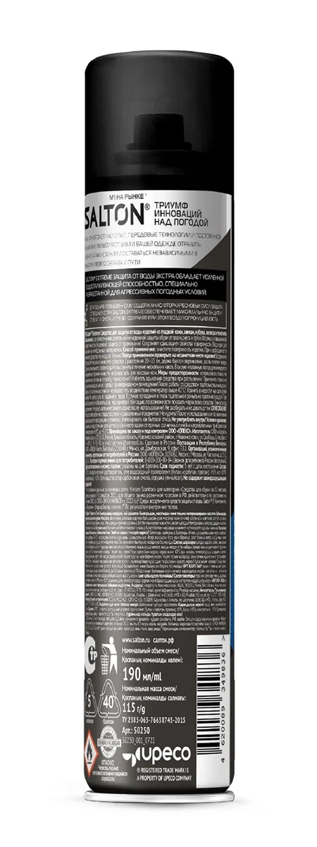 Вода является главным врагом обуви: она безжалостно проникает в нашу обувь, оставляя на поверхности грязные следы и разводы. Но с аэрозолем пропиткой Экстра защита от воды от Salton extreme с усиленной водоотталкивающей способностью Вы можете больше не бояться за любимые ботинки. Благодаря повышенному содержанию фторированных полимеров эта водоотталкивающая пропитка для обуви и одежды обеспечивает максимальную защиту от влаги, сохраняя при этом воздухопроницаемость и эластичность обрабатываемых материалов. Спрей пропитка Экстра защита от воды Salton extreme до двух раз эффективнее аналогов, что подтверждено независимой лабораторией. Средство для защиты от воды Salton extreme подходит для обуви, одежды и других изделий из кожи, замши, нубука, ткани и мембранных материалов. Благодаря удобному распылителю, пропитки Salton extreme хватит на обработку 15-ти пар обуви. Водоотталкивающий спрей Экстра защита от воды Salton extreme послужит мощной защитой от воды для Вашей обуви и одежды.