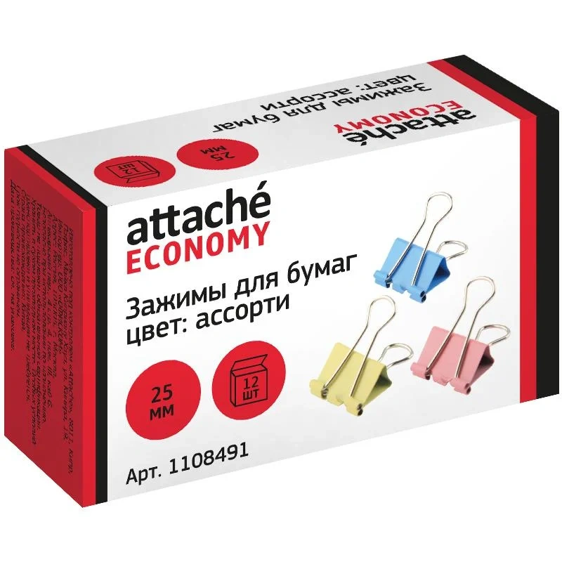 Зажим для бумаг 25мм 12шт/уп Attache Economy, цветные, в карт.коробке