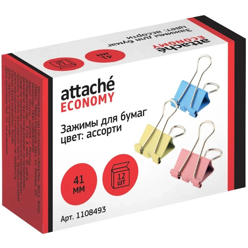 Металлические зажимы для бумаг Attache Economy используются для скрепления документов без использования степлеров. Зажимы с цветным покрытием. Цвета зажимов в упаковке: желтый, синий, голубой, розовый. Размер зажима: ширина 41 мм, высота 63 мм, глубина закладки 20 мм. Позволяет скреплять до 170 листов плотностью 80 г/кв.м, не деформируя при этом бумагу. Зажимы для бумаг поставляются по 12 штук в картонной упаковке. В транспортном коробе 108 упаковок. Зажимы мягко скрепляют большое количество листов, не оставляя следов после удаления и не повреждая бумагу.