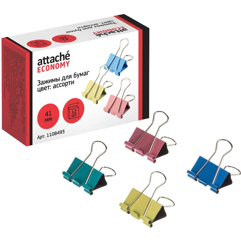 Зажим для бумаг 41мм 12шт/уп Attache Economy, цветные, в карт.коробке