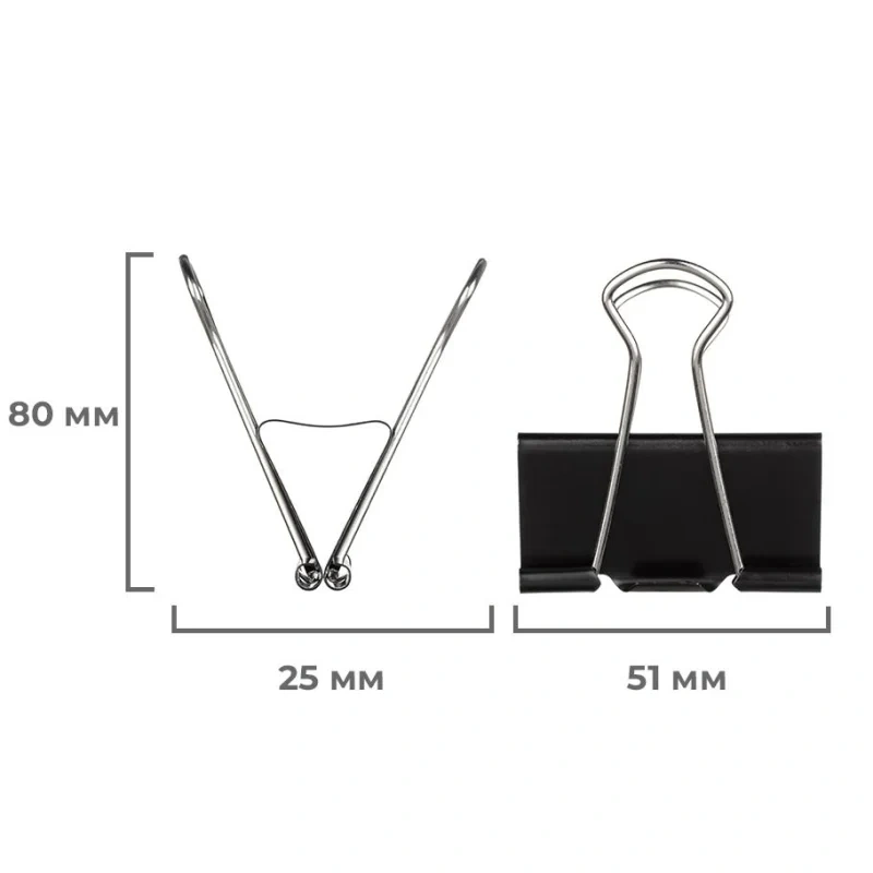 Металлические зажимы для бумаг Выбор есть используются для скрепления документов без использования степлеров. Зажимы из металла с черным покрытием. Размер зажима: ширина 51 мм, высота 80 мм, глубина закладки 25 мм. Позволяет скреплять не менее 240 листов плотностью 80 г/кв.м. Зажимы для бумаг поставляются по 12 штук в картонной упаковке. Зажимы мягко скрепляют большое количество листов, не оставляя следов после удаления и не повреждая бумагу.