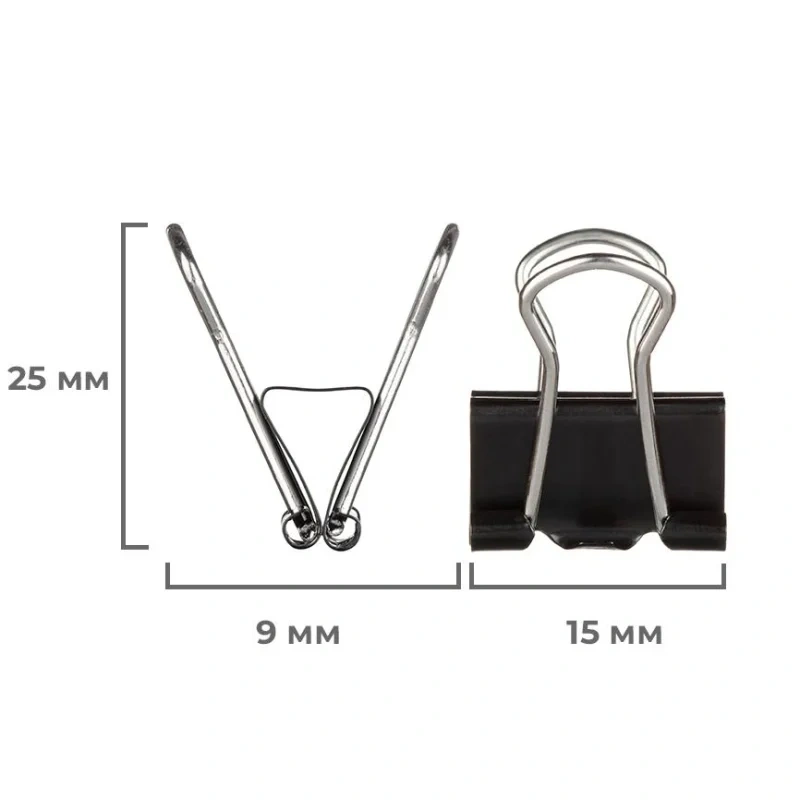 Металлические зажимы для бумаг Attache используются для скрепления документов без использования степлеров. Зажимы из металла с черным покрытием. Размер зажима: ширина 15 мм, высота 25 мм, глубина закладки 9 мм. Позволяет скреплять до 60 листов плотностью 80 г/кв.м, не деформируя при этом бумагу. Зажимы для бумаг поставляются по 12 штук в картонной упаковке.