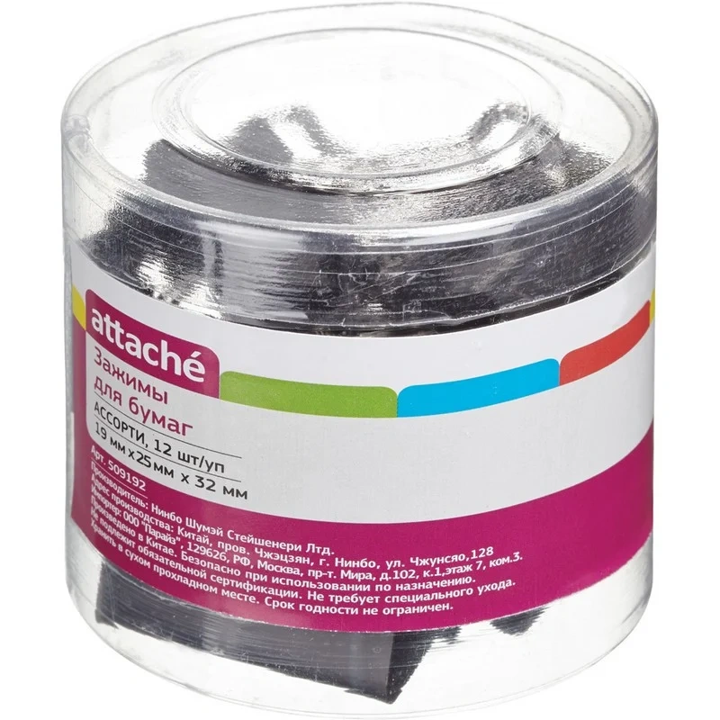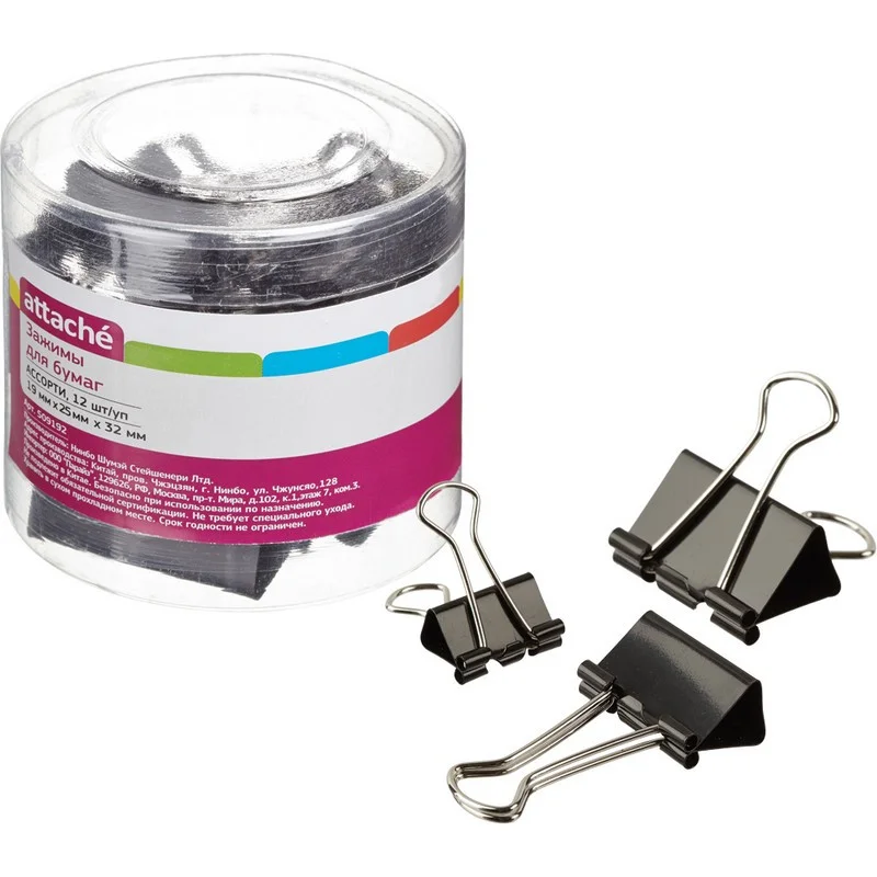 Металлические зажимы для бумаг Attache используются для скрепления документов без использования степлеров. Зажимы из металла с черным покрытием. В одной упаковке зажимы трех размеров. Размеры зажимов: (ширина х высота х глубина закладки) 19×33×9 мм, 25×42×13 мм, 32×53×15 мм. Позволяет скреплять: зажимы шириной 19 мм — до 80 листов, 25 мм — до 100 листов, 32 мм — до 140 листов плотностью 80 г/кв.м, не деформируя при этом бумагу. Зажимы для бумаг поставляются по 12 штук в удобной для хранения пластиковой упаковке. В транспортном коробе 24 упаковки.