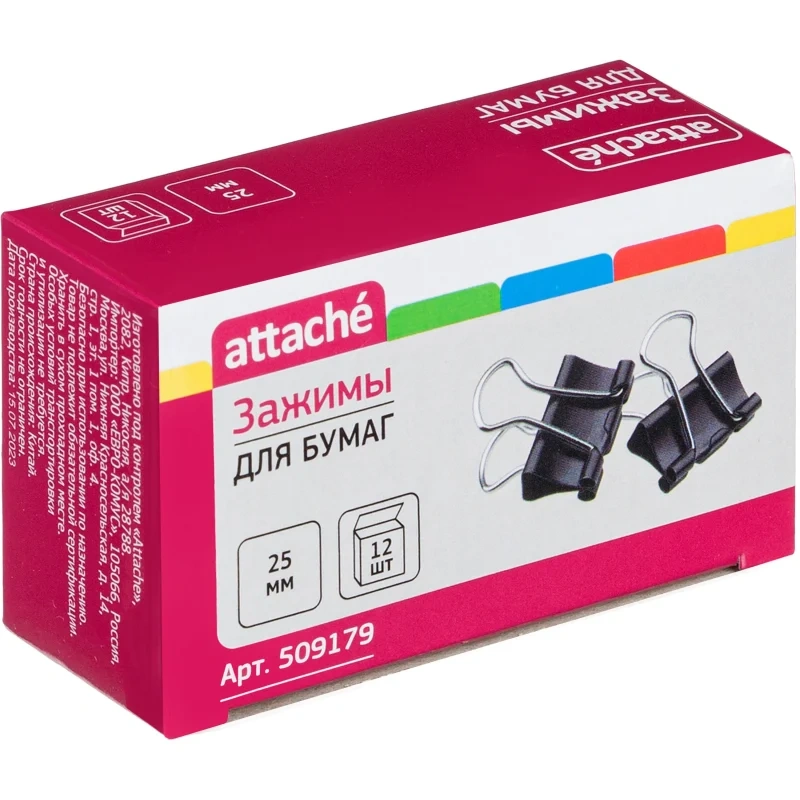 Металлические зажимы для бумаг Attache используются для скрепления документов без использования степлеров. Зажимы из металла с черным покрытием. Размер зажима: ширина 25 мм, высота 42 мм, глубина закладки 14 мм. Позволяет скреплять до 100 листов плотностью 80 г/кв.м, не деформируя при этом бумагу. Зажимы для бумаг поставляются по 12 штук в картонной упаковке.