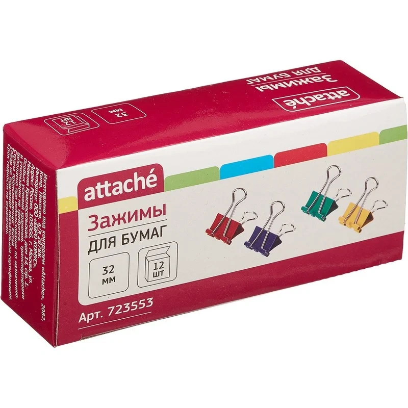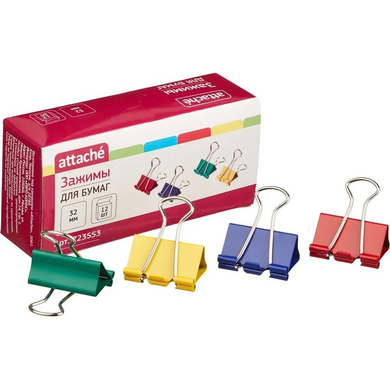 Зажимы для бумаг Attache 32мм, цветные, 12шт/уп, в коробке