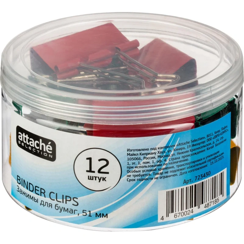 Металлические зажимы для бумаг Attache Selection используются для скрепления документов без использования степлеров. Зажимы с цветным покрытием. Цвета зажимов в упаковке: желтый, синий, красный, зеленый. Размер зажима: ширина 51 мм, высота 38 мм, глубина закладки 11 мм. Позволяет скреплять до 240 листов плотностью 80 г/кв.м, не деформируя при этом бумагу. Зажимы для бумаг поставляются по 12 штук в удобной для хранения пластиковой упаковке с закручивающейся крышкой. В транспортном коробе 50 упаковок. Зажимы Attache Selection — это надежное скрепление документов. Зажимы мягко скрепляют большое количество листов, не оставляя следов после удаления и не повреждая бумагу.