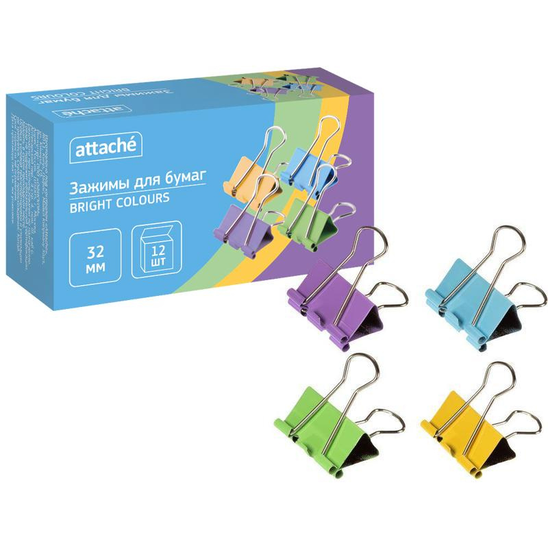 Зажимы для бумаг Attache Bright Colours 32мм, разноцветные, 12шт/уп