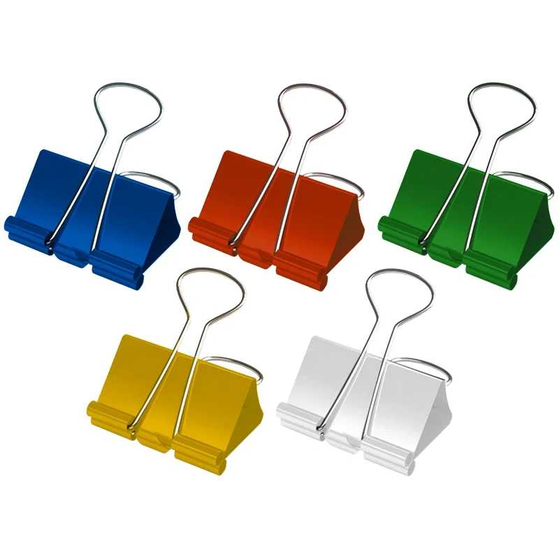 Зажимы выполнены в ярких цветах. Надежно скрепляют и не деформируют бумагу. Скрепляют до 200 листов, не оставляют на ней следов. Упакованы в картонную коробку по 12 шт. Цвета - ассорти.