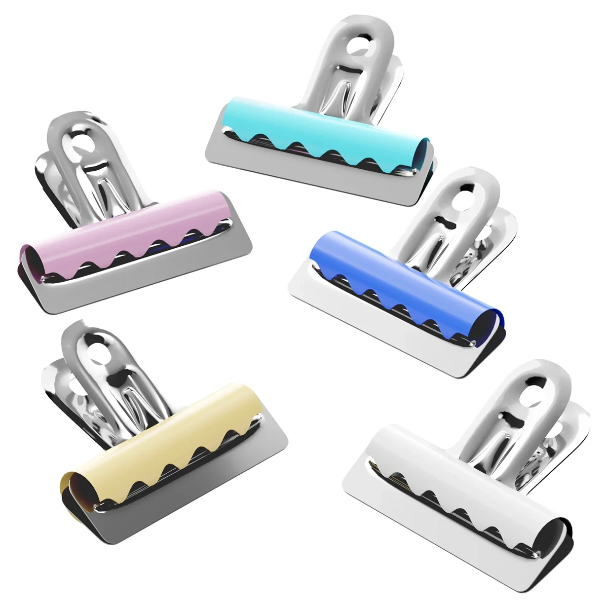 Зажимы выполнены в ярких цветах. Надежно скрепляют и не деформируют бумагу. Скрепляют до 90 листов, не оставляют на ней следов. Упакованы в картонную коробку по 10 шт. Цвета - ассорти.
