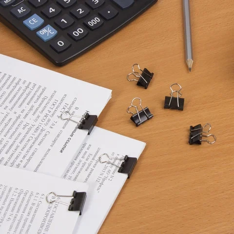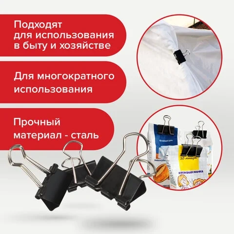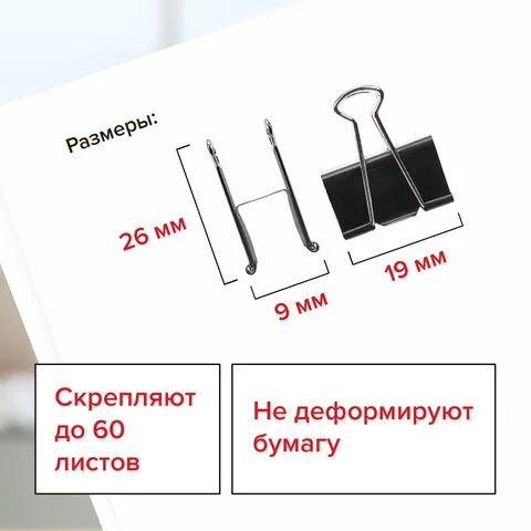 Изготовлены из стали с черным покрытием. Позволяют скреплять до 60 листов. Не деформируют бумагу. Ширина зажима - 19 мм. Поставляются по 12 штук в картонной коробке.