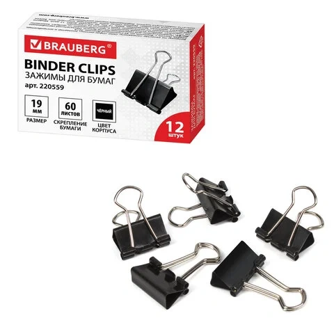 Зажимы для бумаг Brauberg 19мм, черные, 12 шт/уп