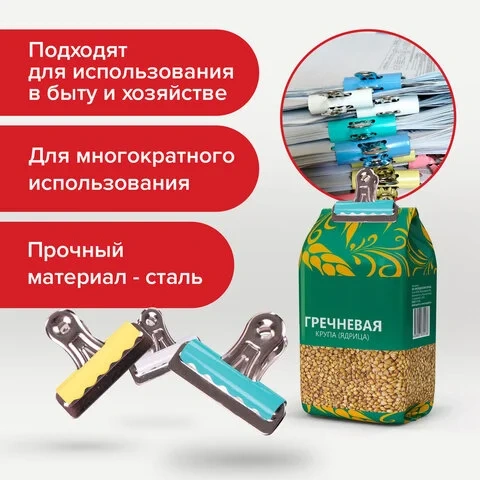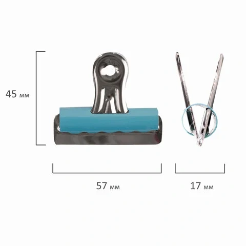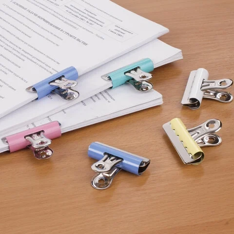 Изготовлены из стали с цветным покрытием. Эргономичный дизайн и яркие цвета выгодно выделяют зажимы-бульдоги среди традиционных канцелярских мелочей. Позволяют скреплять до 90 листов. Не деформируют бумагу. Ширина зажима - 57 мм. Поставляются по 10 штук в картонной коробке.