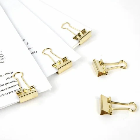 Изготовлены из стали с золотистым покрытием. Позволяют скреплять до 60 листов. Не деформируют бумагу. Ширина зажима - 19 мм. Поставляются по 12 штук в пластиковой коробке с подвесом.
