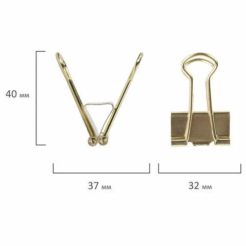 Изготовлены из стали с золотистым покрытием. Позволяют скреплять до 140 листов. Не деформируют бумагу. Ширина зажима - 32 мм. Поставляются по 12 штук в пластиковой коробке с подвесом.