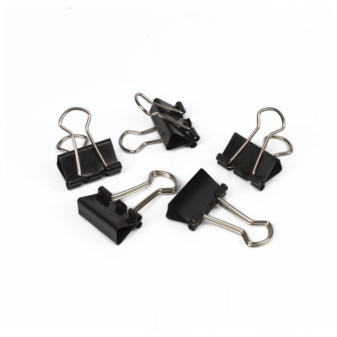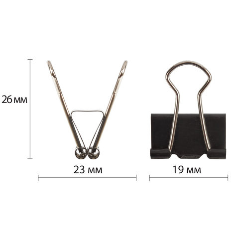 Изготовлены из стали с черным покрытием. Позволяют скреплять до 60 листов. Не деформируют бумагу. Ширина зажима - 19 мм. Поставляются по 12 штук в картонной коробке.