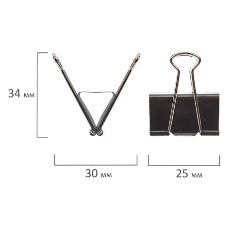 Изготовлены из стали с черным покрытием. Позволяют скреплять до 100 листов. Не деформируют бумагу. Ширина зажима - 25 мм. Поставляются по 12 штук в картонной коробке.