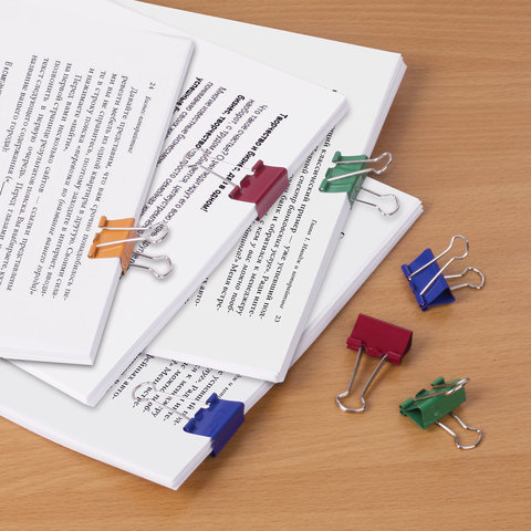 Изготовлены из стали с цветным покрытием. Позволяют скреплять до 100 листов. Не деформируют бумагу. Ширина зажима - 25 мм. Поставляются по 12 штук в картонной коробке.