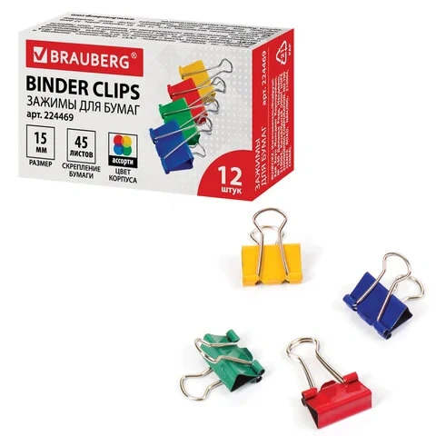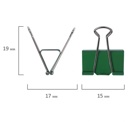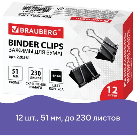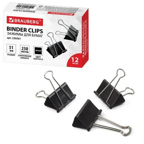 Изготовлены из стали с черным покрытием. Позволяют скреплять до 100 листов. Не деформируют бумагу. Ширина зажима - 25 мм. Поставляются по 12 штук в картонной коробке.