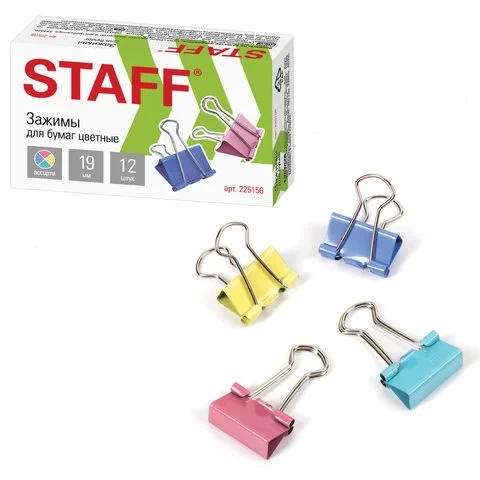 Зажимы для бумаг Staff 19мм, ассорти, 12 шт/уп