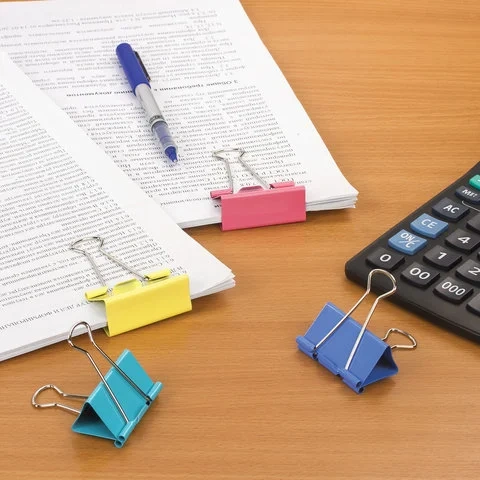 Изготовлены из стали с цветным покрытием. Позволяют скреплять до 230 листов. Не деформируют бумагу. Ширина зажима - 51 мм. Поставляются по 12 штук в картонной коробке.