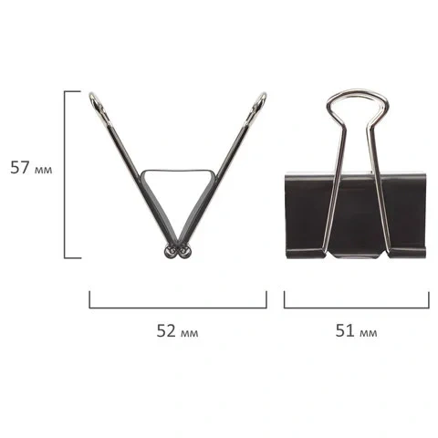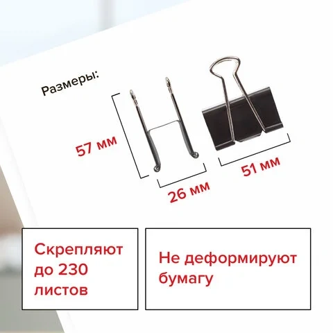 Изготовлены из стали с черным покрытием. Позволяют скреплять до 230 листов. Не деформируют бумагу. Ширина зажима - 51 мм. Поставляются по 12 штук в картонной коробке.