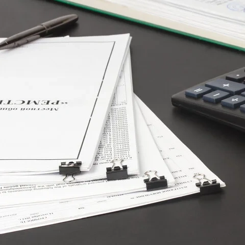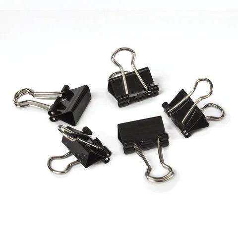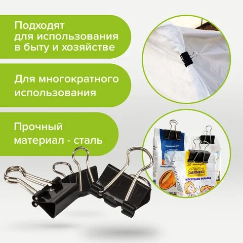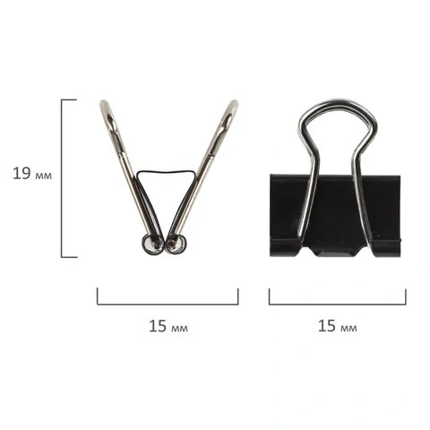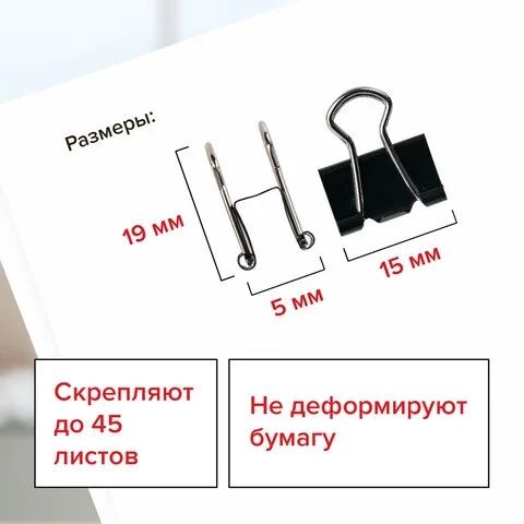 Изготовлены из стали с черным покрытием. Позволяют скреплять до 45 листов. Не деформируют бумагу. Ширина зажима - 15 мм. Поставляются по 12 штук в картонной коробке.