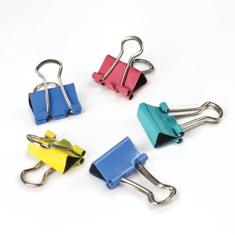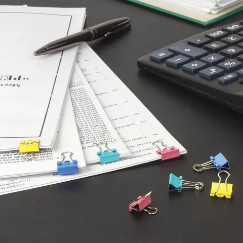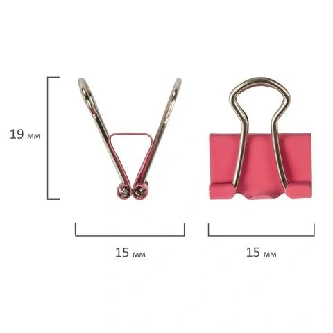Изготовлены из стали с цветным покрытием. Позволяют скреплять до 45 листов. Не деформируют бумагу. Ширина зажима - 15 мм. Поставляются по 12 штук в картонной коробке.