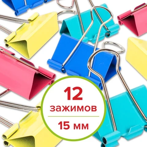 Зажимы для бумаг Staff Profit 15мм, цветные, 12шт/уп