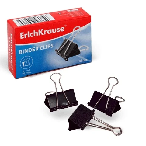 Зажимы для бумаг Erich Krause 19мм, черные, 12 шт/уп, 25086
