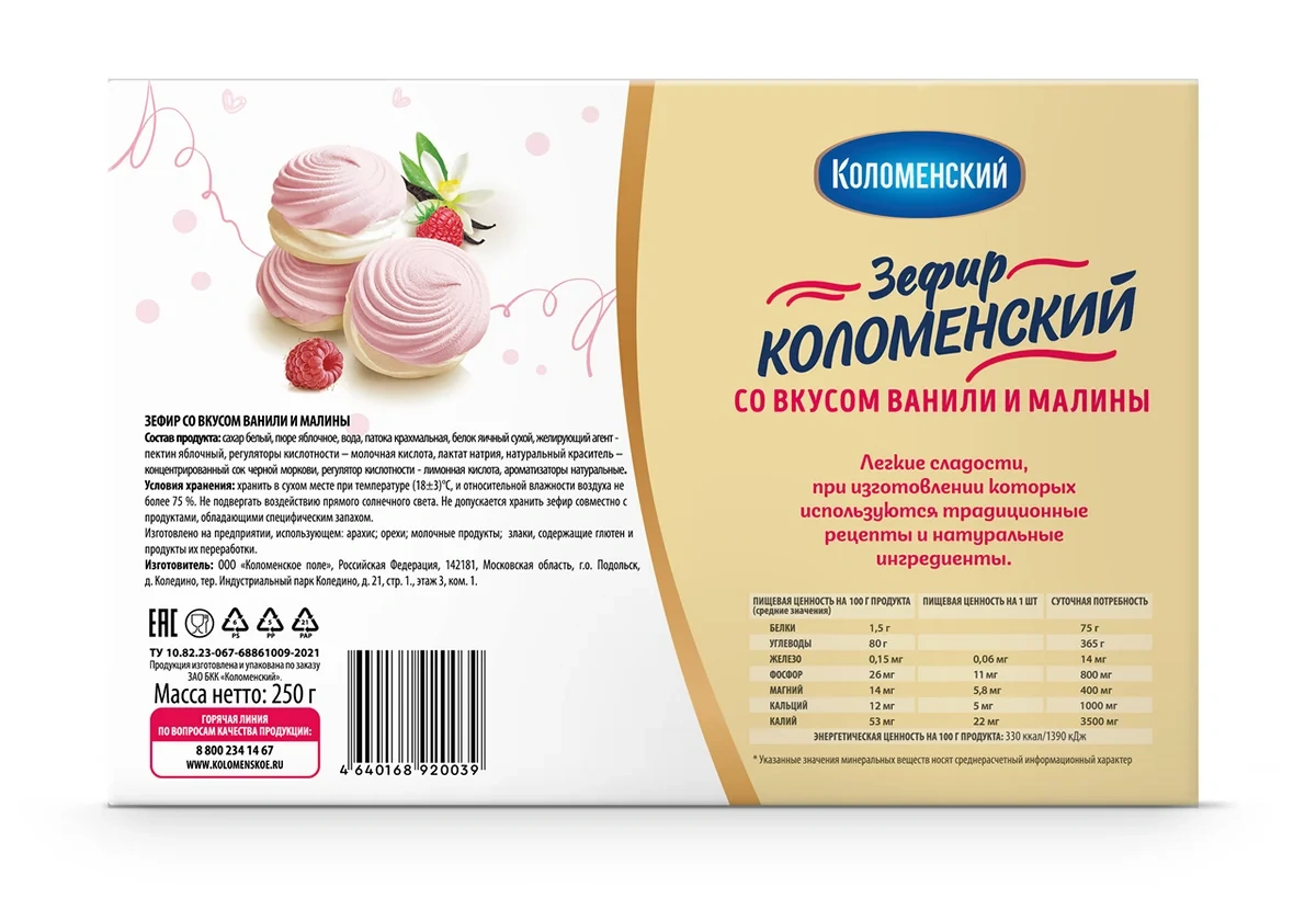 Зефир Коломенское со вкусом ванили и малины, 250г
