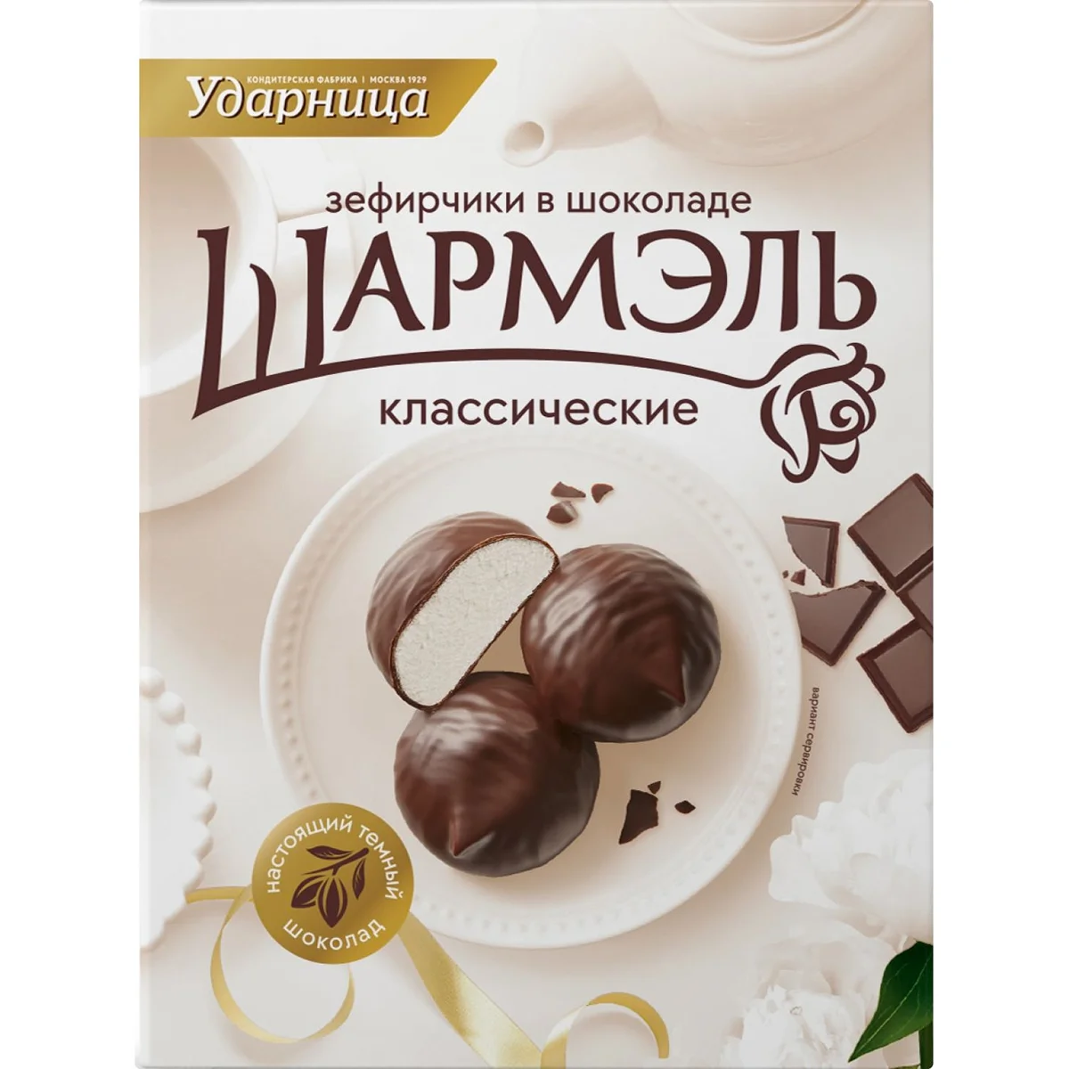 Зефирчики в шоколаде – зефир небольшого размера, покрытый нежной глазурью. Еще мягче, свежее и вкуснее: попробуйте со своим любимым кофе! Более 50 лет назад кондитеры 'Ударницы' создали зефир. С тех пор лакомство готовится по традиционному рецепту на основе яблочного пюре, агара и яичного белка. Зефир 'Шармэль' уже много лет радует сладкоежек нежным вкусом и тонким ароматом! Состав: тёмный шоколад (сахар, какао тёртое, масло какао, какао-порошок, эмульгатор – лецитин подсолнечника, ароматизатор натуральный), сахар, патока, пюре яблочное, белок яичный сухой, желирующий агент – фурцеллярин (агар из фурцеллярии), регулятор кислотности – цитрат натрия, ароматизатор Ваниль.