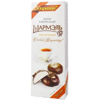 Зефир Шармэль Классический в шоколаде 75 г - это элегантный десерт от известной кондитерской фабрики 'Ударница'. Такое нежное воздушное лакомство в шоколадной глазури может позволить себе любая женщина. Его сердцевинка приготовлена по традиционному рецепту из яблочного пюре, яичного белка и агара, желирующего вещества на основе вытяжки из бурых морских водорослей. Сверху изделие покрыто великолепным темным шоколадом. Непревзойденное сочетание тающей во рту начинки и хрустящей оболочки не оставит равнодушным ни одного ценителя сладостей. Миниатюрная упаковка поместится даже в небольшую дамскую сумочку. Вся продукция делается исключительно из безглютенового сырья и не содержит ГМО.