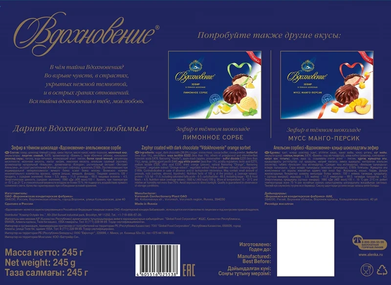 Зефир Вдохновение Апельсиновое сорбе в темном шоколаде, 245г