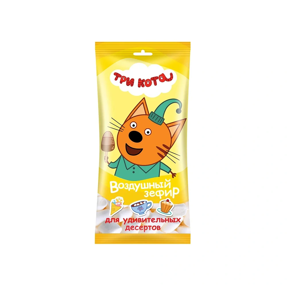 Воздушный зефир для какао и десертов 'Три кота' от группы компаний 'Сладкая сказка' - хит продаж, который обожают маленькие сладкоежки, поклонники популярного мультсериала, и взрослые. Дети любят воздушный зефир, потому что он вкусный, сладкий и мягкий. Для взрослых важно то, чтобы он не содержал искусственных красителей и ароматизаторов. Отличным выбором, который понравится не только детям, но и их родителям, станет воздушный зефир 'Три кота', ведь в его составе - только натуральные ингредиенты, а для приятного аромата используется натуральный ароматизатор - ваниль. Идеальный подарок для детей в школу и детский сад! Кроме того, порционные пакетики удобно давать с собой ребенку в школу, чтобы он полакомился зефирками на переменах, и брать с собой в офис.