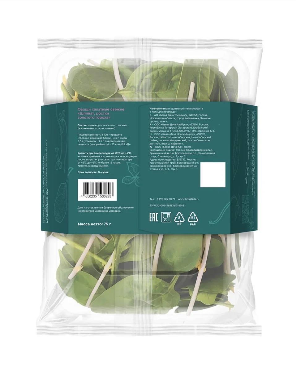 Смесь салатная Белая Дача Шпинат и ростки золотого гороха, 75г
