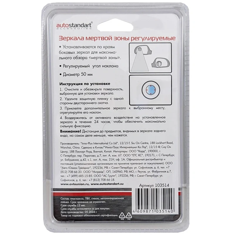 Диаметр 5см. Устанавливаются на внешние боковые зеркала двухсторонней клейкой лентой. Регулируемый угол наклона. Поворачиваются на 360С.