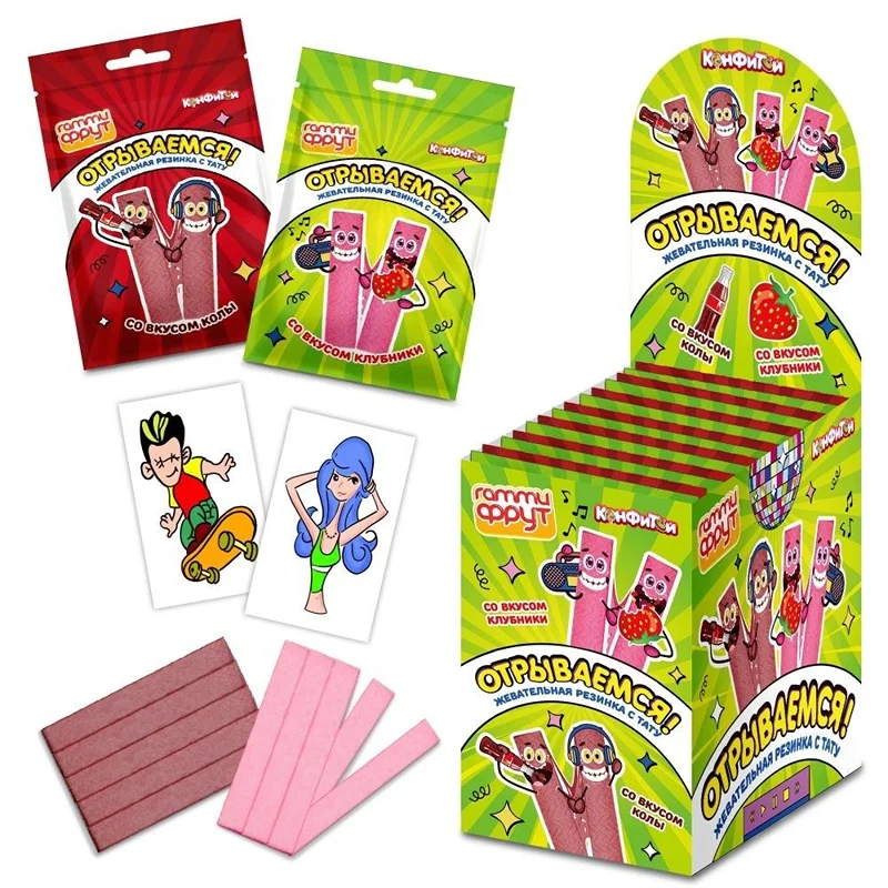 Внутри пакета находит сюрприз – временная переводная татуировка, которую так любят дети. В блоке два цвета и вкуса жвачки: клубника и кола.
