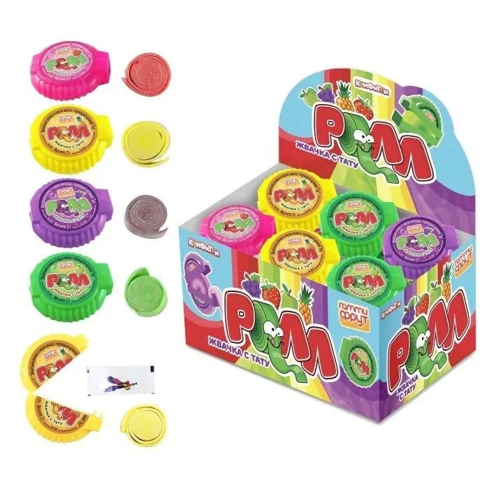 Длинная жевательная резинка (длина 33 см), свернутая в ролл, находится в удобной круглой коробочке. Чтобы полакомиться фруктовой жвачкой, нужно отмотать жвачку и закрыть коробочку. Специальный пластиковый ножичек, находящийся внутри коробочки, ровно отрежет необходимое количество жвачки. В каждой коробочке помимо жвачки находится яркая переводная татушка, которая доставит ребенку дополнительную радость от покупки. В блоке четыре цвета и вкуса жвачки: клубника, ананас, виноград и яблоко.