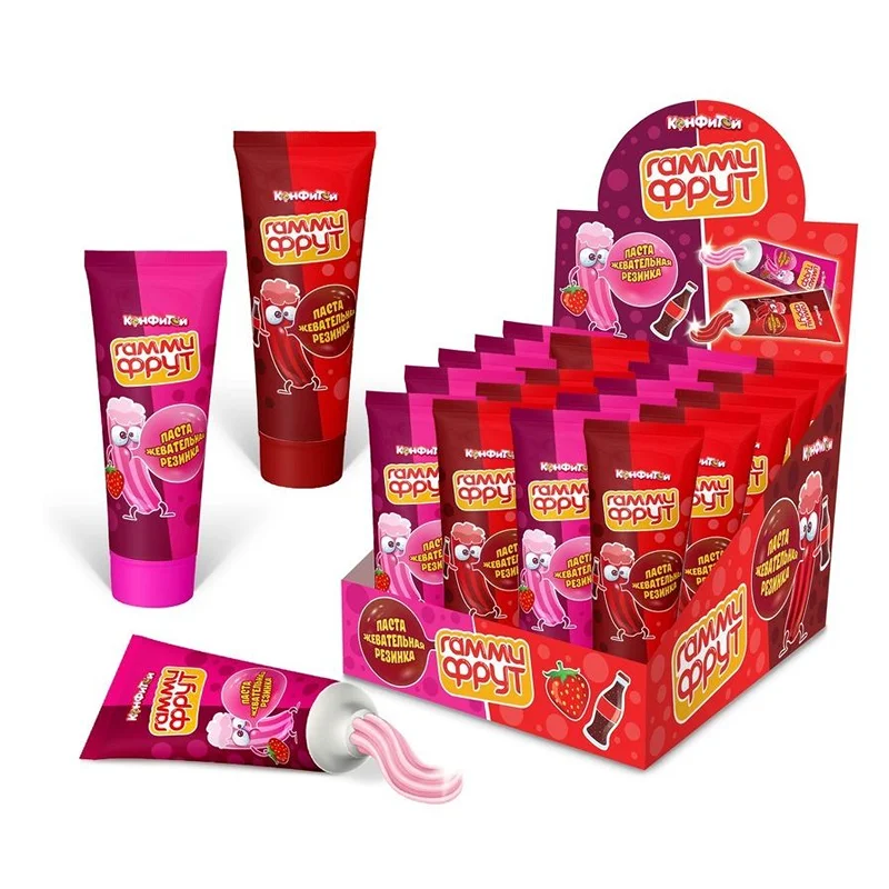 Жевательная резинка-паста отличается от обычной жвачки тем, что имеет нежную, пастообразную структуру, которая легко выдавливается из удобного тюбика прямо в рот и превращается в жвачку. В блоке ассорти из двух насыщенных и ароматных вкусов: клубника и кола.