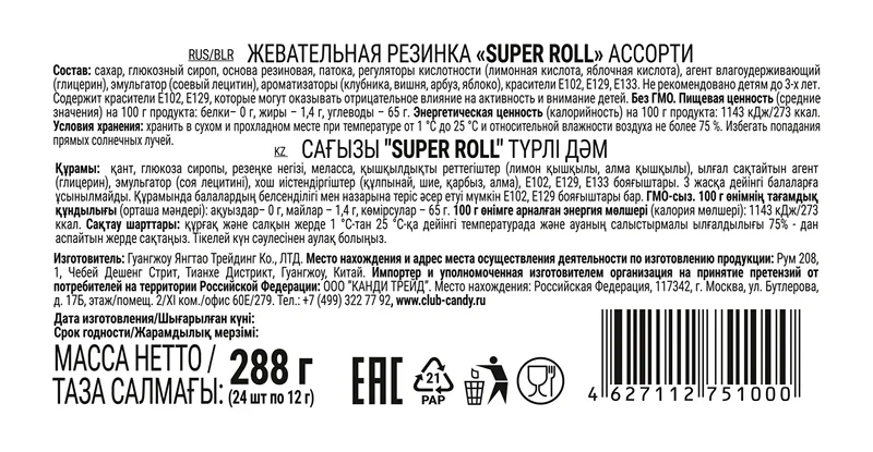 Жевательная резинка Канди клаб Super Roll Ассорти, 10г x 24 шт