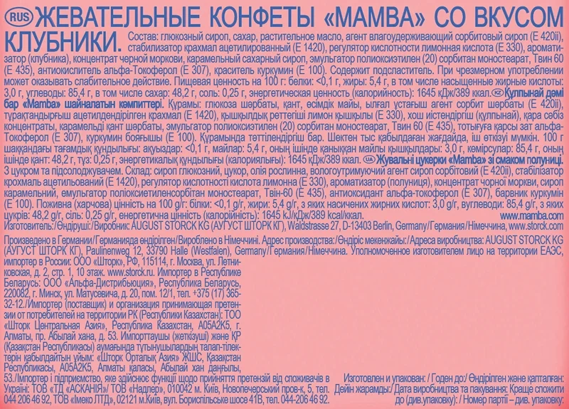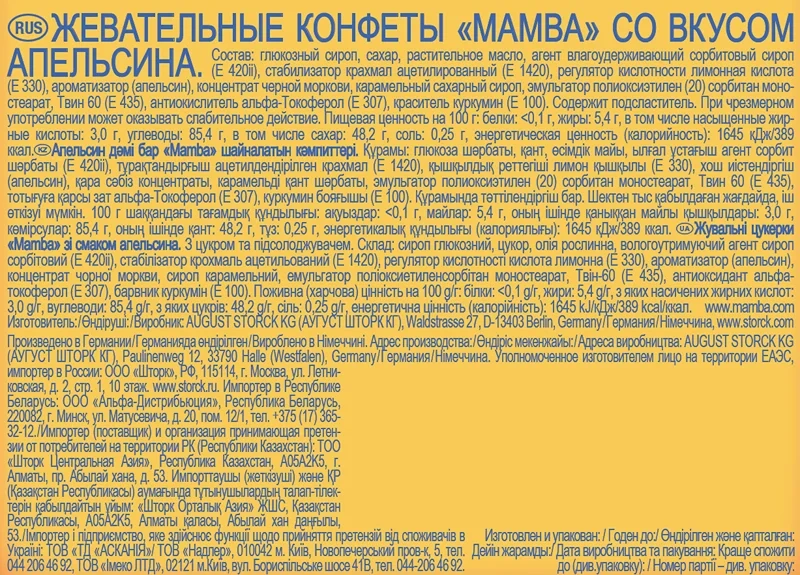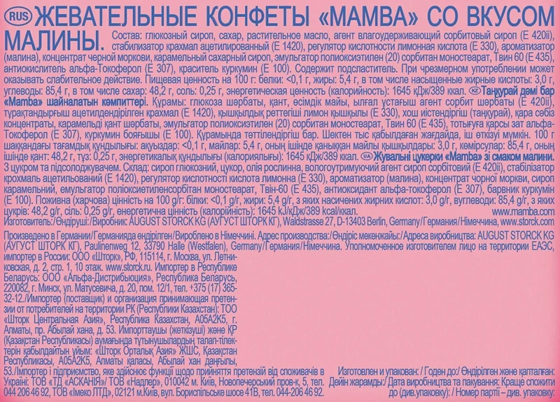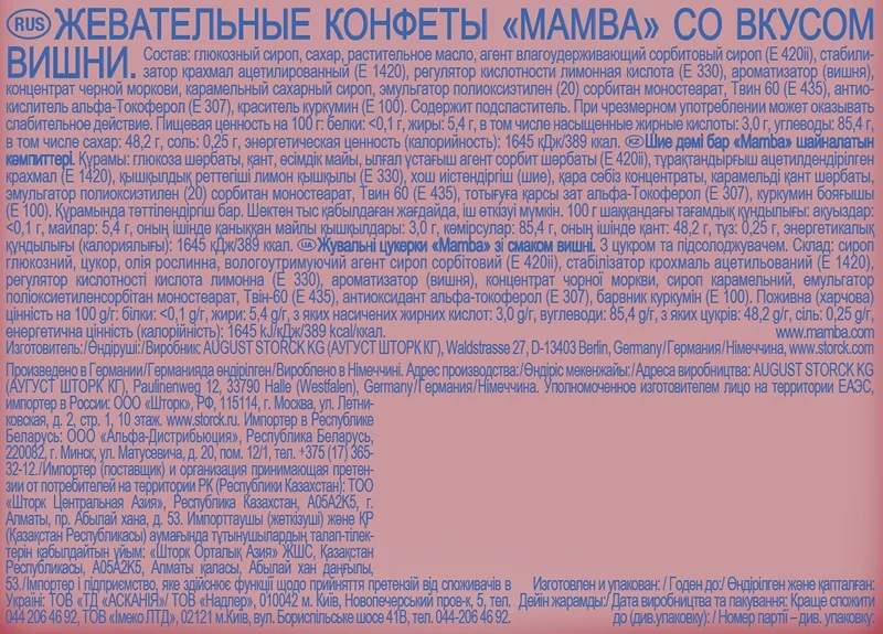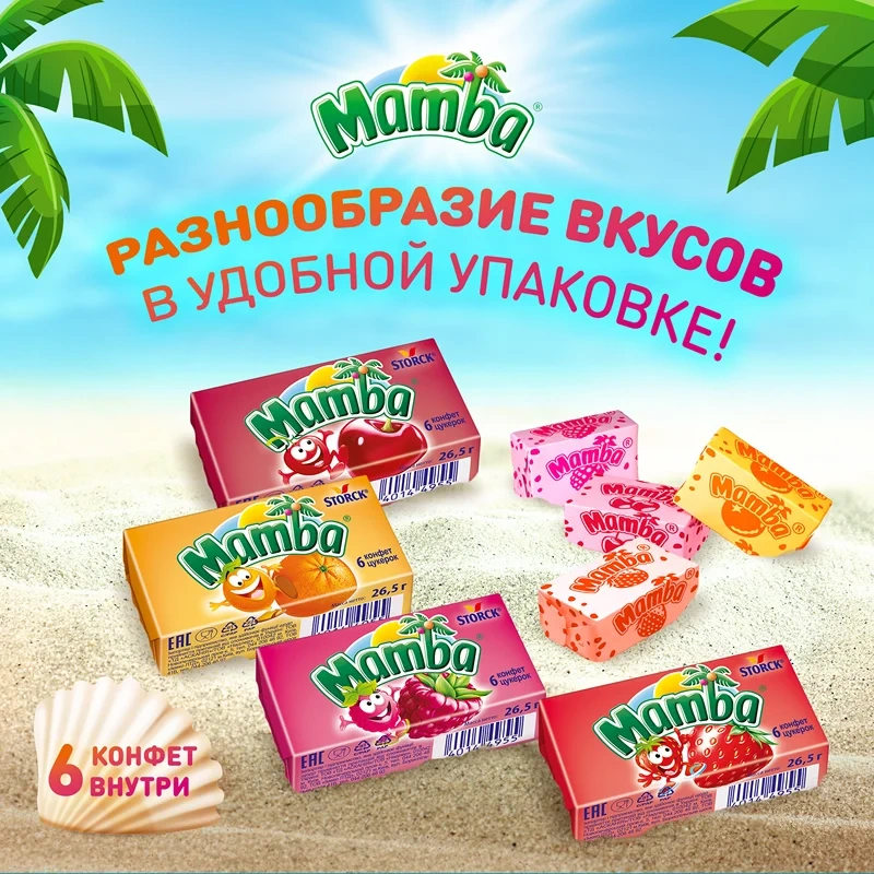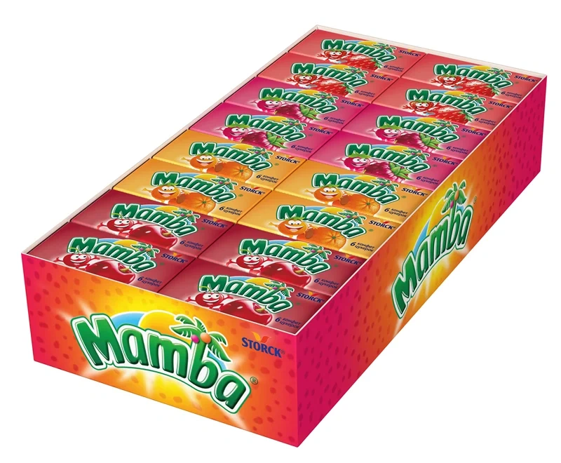 Mamba - это сочные жевательные конфеты с различными вкусами, которые пользуются популярностью среди детей и взрослых! Конфеты Mamba представлены в удобной упаковке, которую так легко взять с собой и поделиться с друзьями. Мамba - жевательные конфеты со вкусами клубники, малины, апельсина, колы или вишни! Каждая упаковка состоит из шести жевательных конфет в индивидуальной обертке. В большой упаковке вы найдете ассорти вкусов, чтобы поделиться с друзьями.