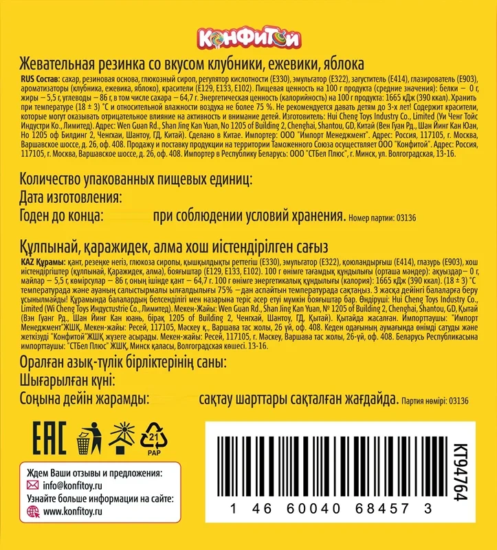 Жевательная резинка Конфитой Gummy Fruit автомат, 30г