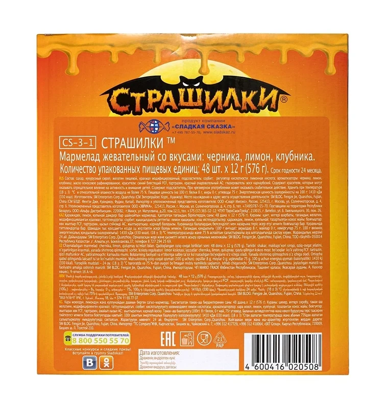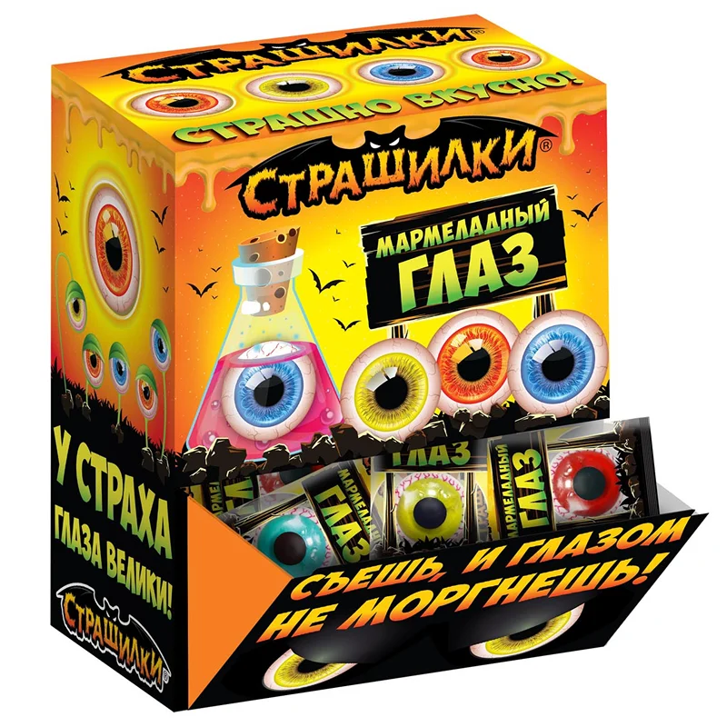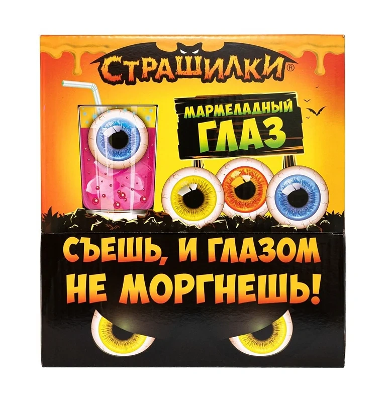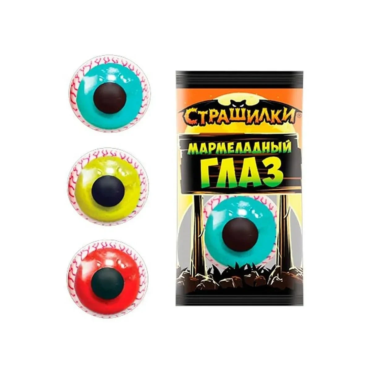 Страшно вкусное угощение! Страшилки Мармеладный глаз — это креативный подарок, который станет настоящей находкой для всех, кто любит необычные сюрпризы. Набор Страшилки — отличная идея для коллективного поздравления, которое понравится детям и взрослым. Прикольная вкусняшка идеально подойдет для тематических вечеринок и Хэллоуина. Мармеладки со вкусами черники, лимона, клубники — яркие и эффектные — украсят детские праздники, дни рождения и Новый год. Мармелад — это угощение, которое нравится и девочкам, и мальчикам, их папам и мамам, друзьям и учителям. Преподнесите набор мармелада в подарок на первое сентябре или выпускной из детского сада сыну или дочке, группе детей, своей подруге — и взрослые, и дети любят кислые и сладкие вкусняшки со вкусом фруктов.