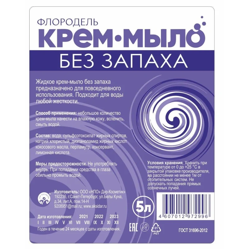 Крем-мыло Без Запаха 5 л. Назначение: крем-мыло Без Запаха серии Флородель имеет густую консистенцию. Это нейтральное моющее средство для удаления загрязнений с различных поверхностей кожи, является мягким в дерматологическом отношении составом. Содержит комплекс ПАВ из природных жиров кокосового масла. Очищает кожу, сохраняя ее естественный липидный слой. Способ применения: небольшое количество мыла нанести на влажную кожу, вспенить, смыть водой. Меры предосторожности: не употреблять внутрь. При попадании в глаза промыть проточной водой. Состав: вода, сульфоэтоксилат жирных спиртов, натрий хлористый, диэтаноламид жирных кислот кокосового масла, перламутр, консервант, лимонная кислота. Условия хранения: хранить при температуре от 0 до 25 градусов Цельсия в закрытой упаковке изготовителя, на расстоянии не менее 1 метра от отопительных систем. Не допускать попадания прямых солнечных лучей. Срок годности: 24 месяца с даты изготовления. <!--noindex-->Внешний вид и/или характеристики товара могут быть изменены производителем в соответствии с производственным процессом.<!--/noindex-->