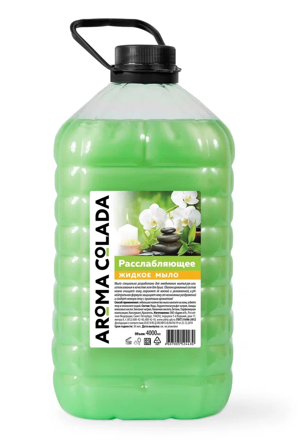 Мыло жидоке Арома Колада 4л туалетное РАССЛАБЛЯЮЩЕЕЖидкое крем-мыло , бережно очищает и не нарушает естественный РН-баланс кожи. Содержит смягчающую питательную композицию, которая сохраняет кожу рук и оберегает их от излишней сухости. Разработано для ежедневного мытья рук или использования в качестве геля для душа.Аромат свежий расслобляющийСбалансированный состав обладает хорошим очищающим эффектом.Благодаря смягчающим компонентам сохраняет защитные функции кожи, не вызывая сухости и раздражения.рН-нейтральная формула подходит для всех типов кожи.Высокая концентрация обеспечивает антибактериальный эффект и экономичный расход.Способ примененияНанесите небольшое количество мыла на влажную кожу, добейтесь образования пены и ополосните ее водой.Составлаурилэтоксисульфат натрия, амиды кокосовых кислот, бензонат натрия, лимонная кислота, бетаин, парфюмерная композиция, консервант, краситель, вода