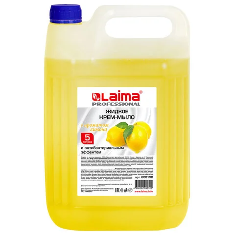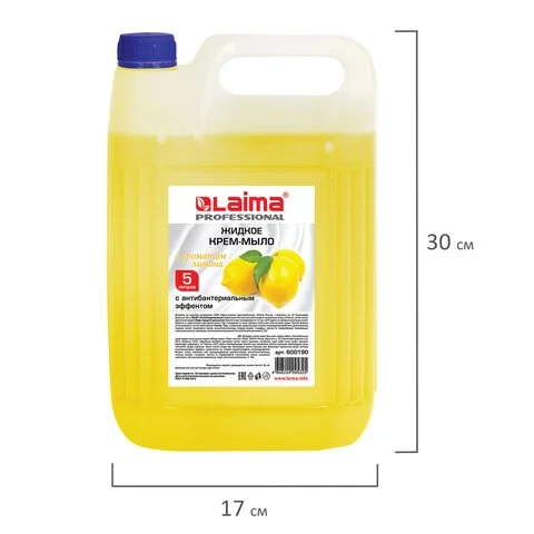 Жидкое мыло наливное Laima Professional 5л, лимон, с антибактериальным эффектом, 600190